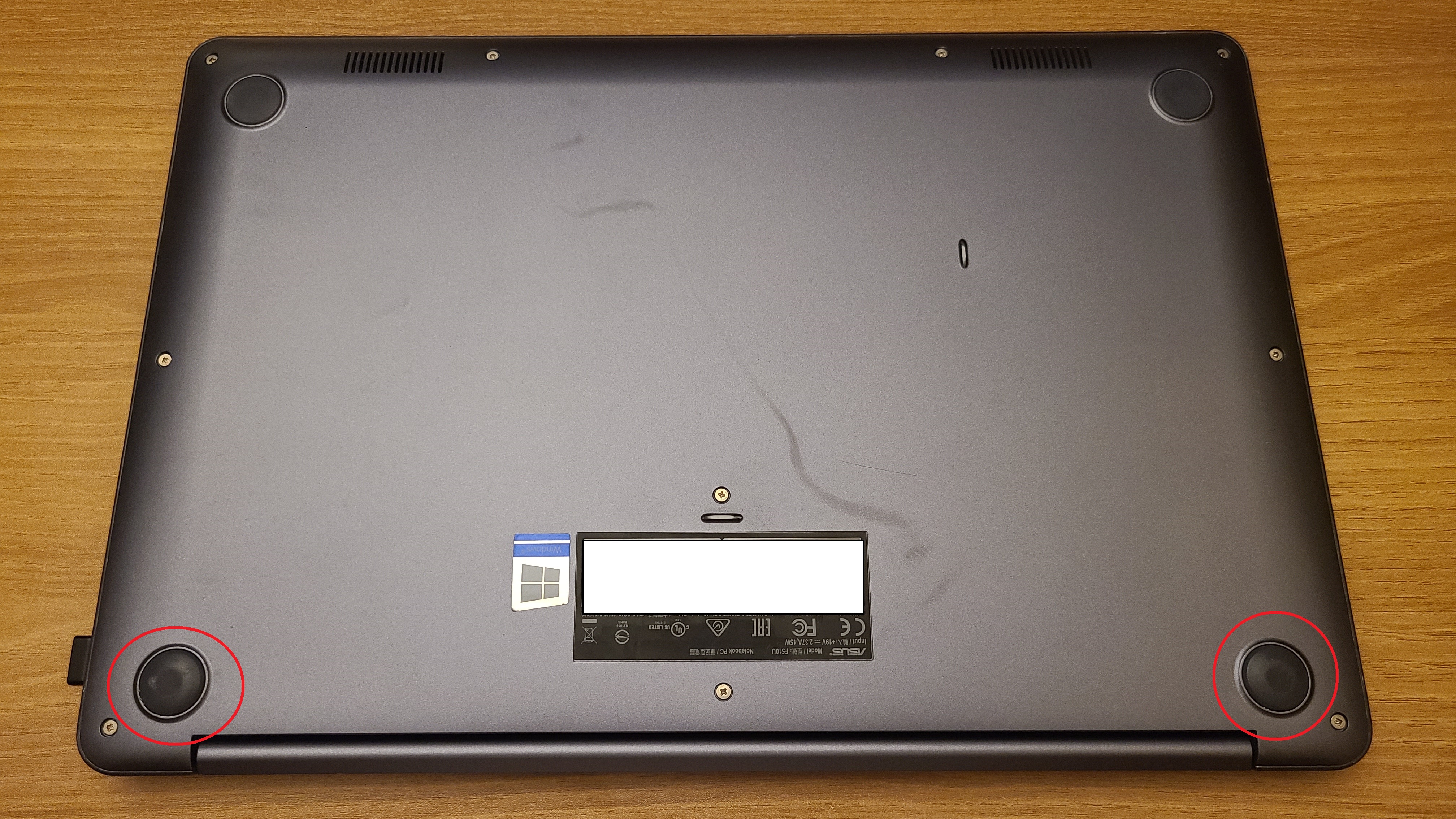 아래 사진의 빨간 원으로 표시된 고무판을 손톱이나 카드 따위로 떼어내면 나사가 존재한다.