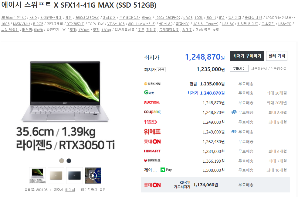GPU는 엔비디아에서 작년 가을 출시한 3000번대 RTX그래픽카드의 노트북향이다. 중급~중고급형이다.