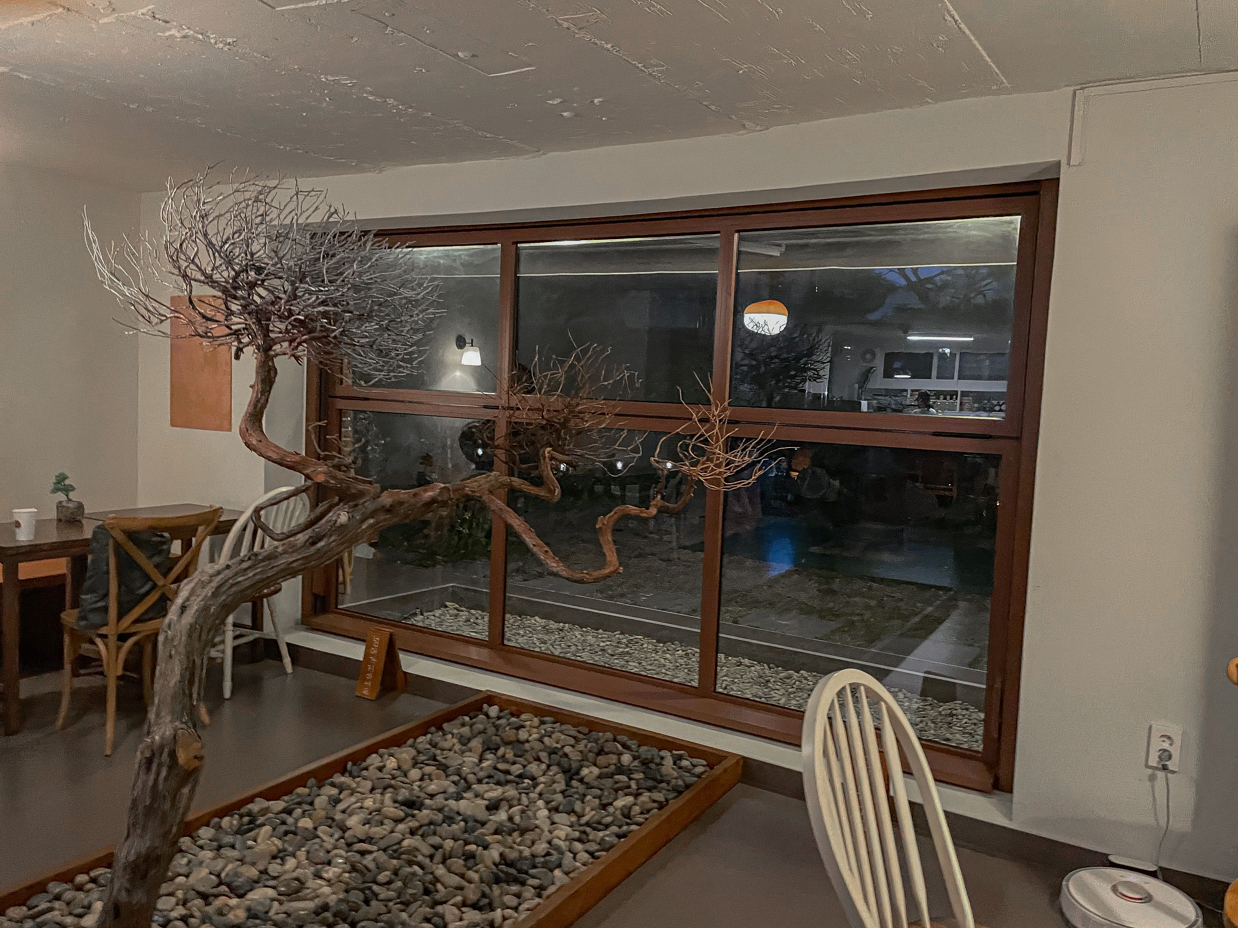 아래 자갈밭이 바깥으로 이어지는 것처럼 인테리어되어