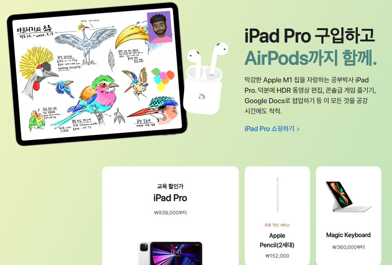 아이패드도 마찬가지로 기본 할인 및 에어팟 2세대를 무료로 제공한다.
