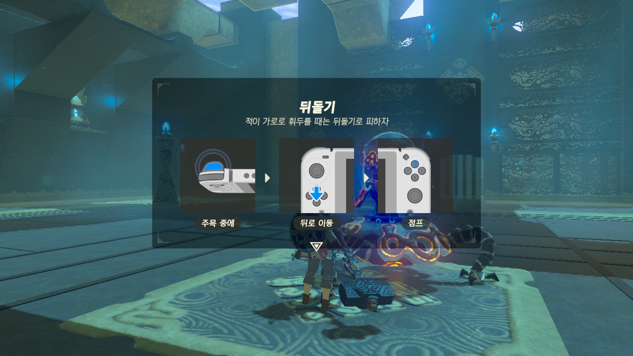 회피 기술 사용법 <옆으로 뛰기>를 가이드 받는다. <옆으로 뛰기>는 적이 세로로 공격할 때 사용한다.