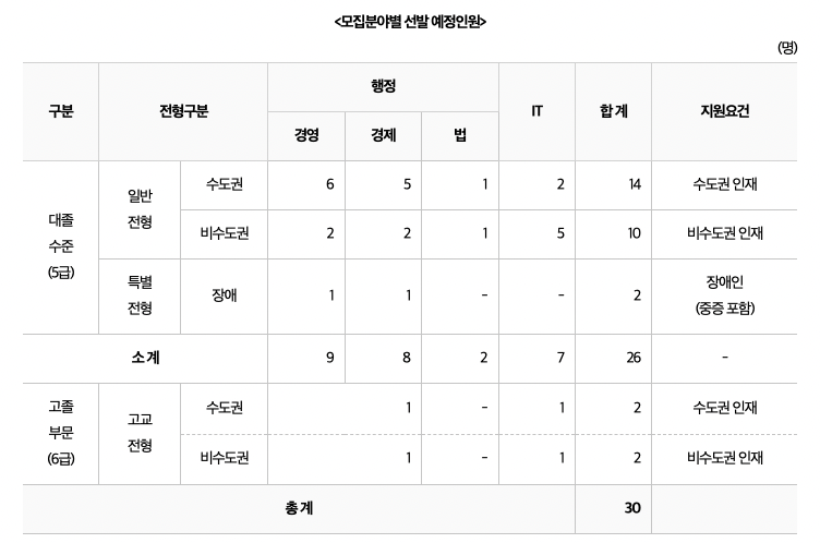 - 채용 인원 : 총 30명 (대졸수준 26명, 고졸부문 4명)