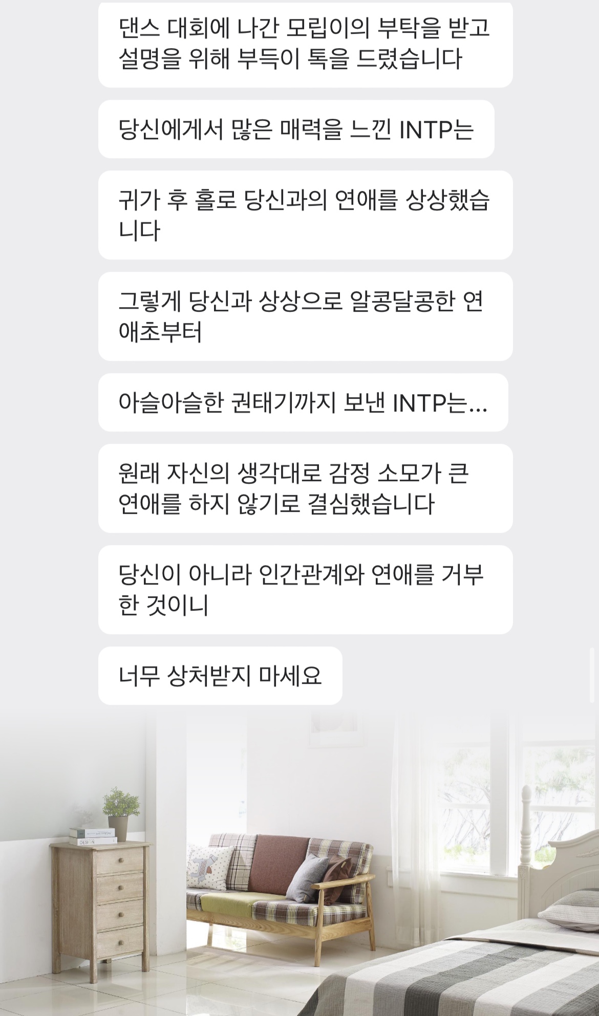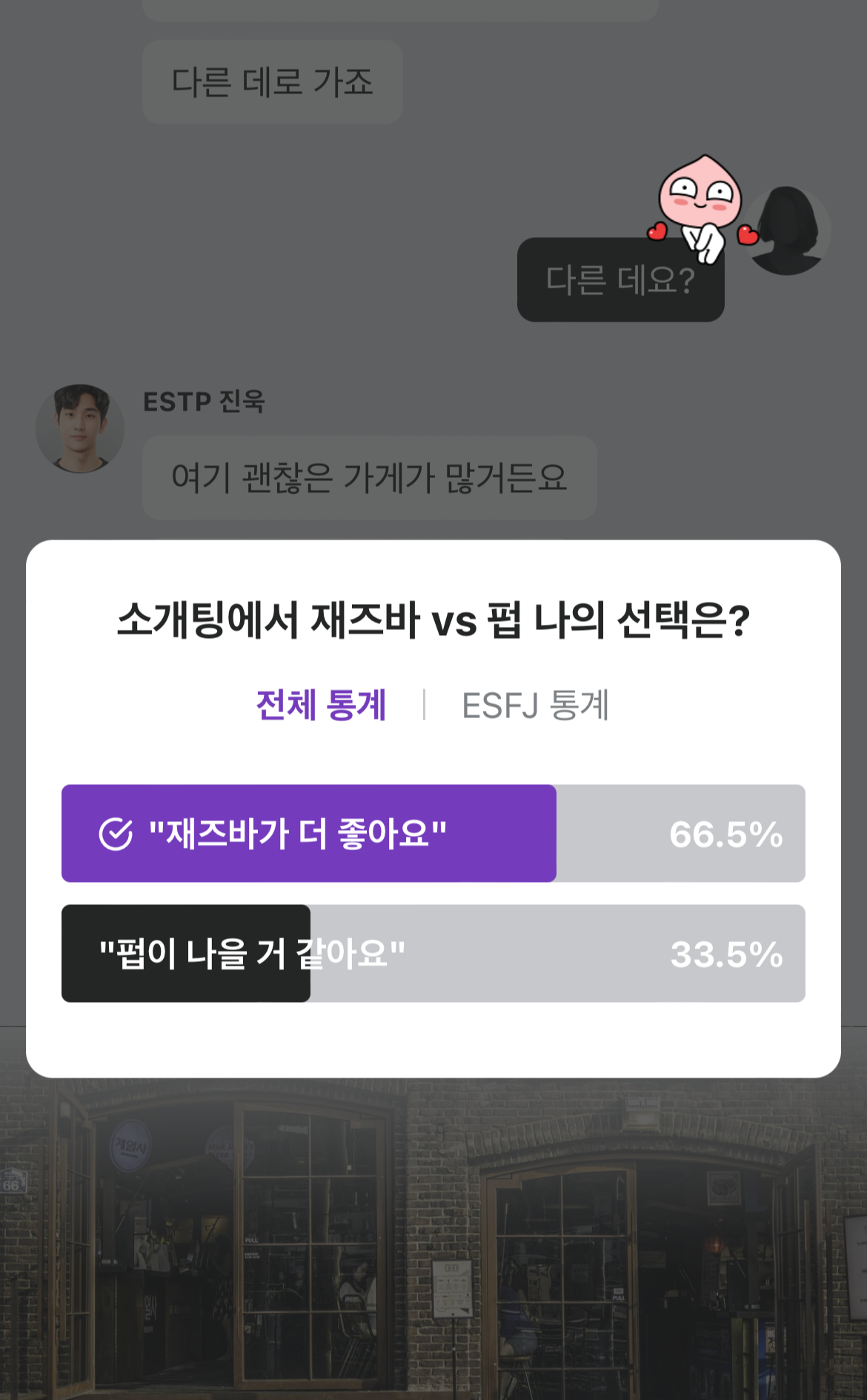 이 컨텐츠는 말 그대로 16가지 타입의 MBTI 성격 별로 분류된 이성과 가상으로 소개팅을 할 수 있다.