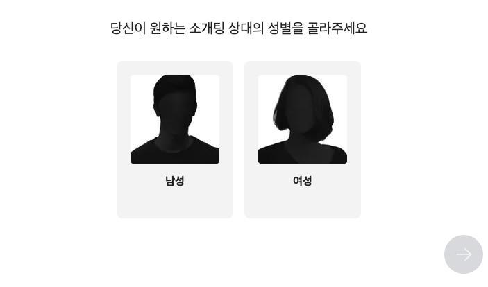 전에는 없던 소개팅 상대의 성별 선택 페이지가 아래와 같이 나오는 것을 확인할 수 있다!