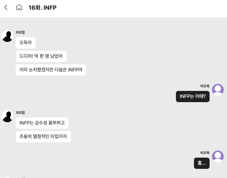 어느새 마지막 편인 16화 INFP편까지 왔다.