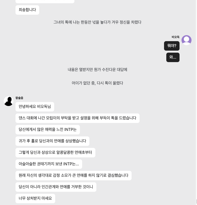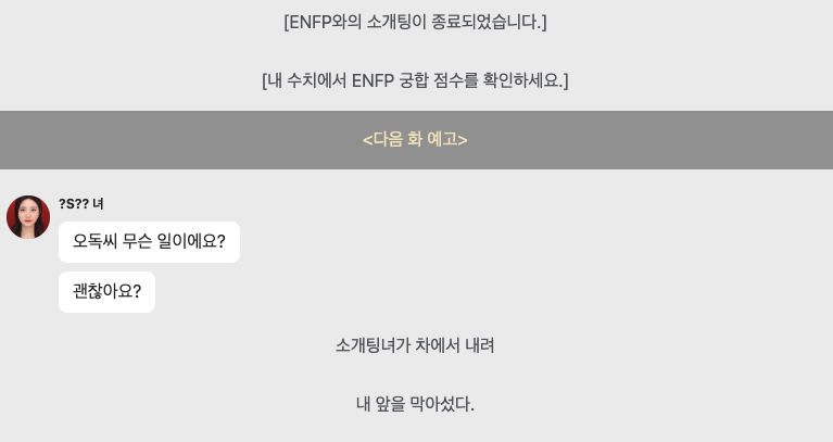 1편 INTJ와의 만남이 끝나고 나면 2편은 ENFP의 상대가 나타난다.