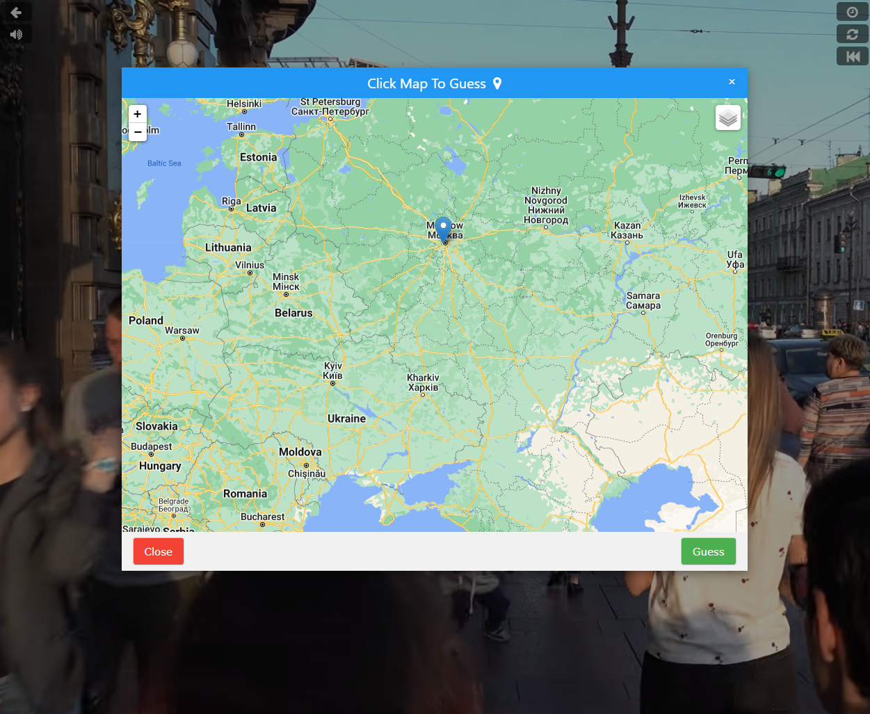 짐작되는 장소를 지도 상에서 클릭하여 마크를 남기고, 우측하단 Guess이 적힌 초록색 버튼을 누르면 된다.