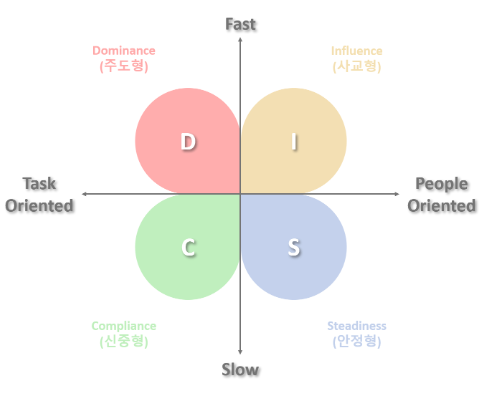 미국 콜롬비아대학 심리학교수 Willam Mouston Marston 박사의 연구 결과에 따르면, 인간은 자신이 처한 환경, 그리고 그 환경 속에서 본인을 어떻게 인식하느냐에 따라 4개의 형태로 나뉘어 행동을 하게 된다고 합니다. 박사는 이러한 인식을 축으로 인간의 행동을 각각 주도형(Dominance), 사교형(Influence), 안정형(Steadiness), 신중형(Compliance) 으로 나누었습니다.
