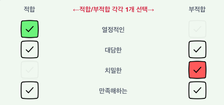 - 각 문항의 4가지 단어 중 본인과 가장 가까운 단어를 적합으로 선택, 가장 먼 단어는 부적합으로 선택 (가장 적합한 단어+가장 부적합 단어 = 총 2개 단어 선택)