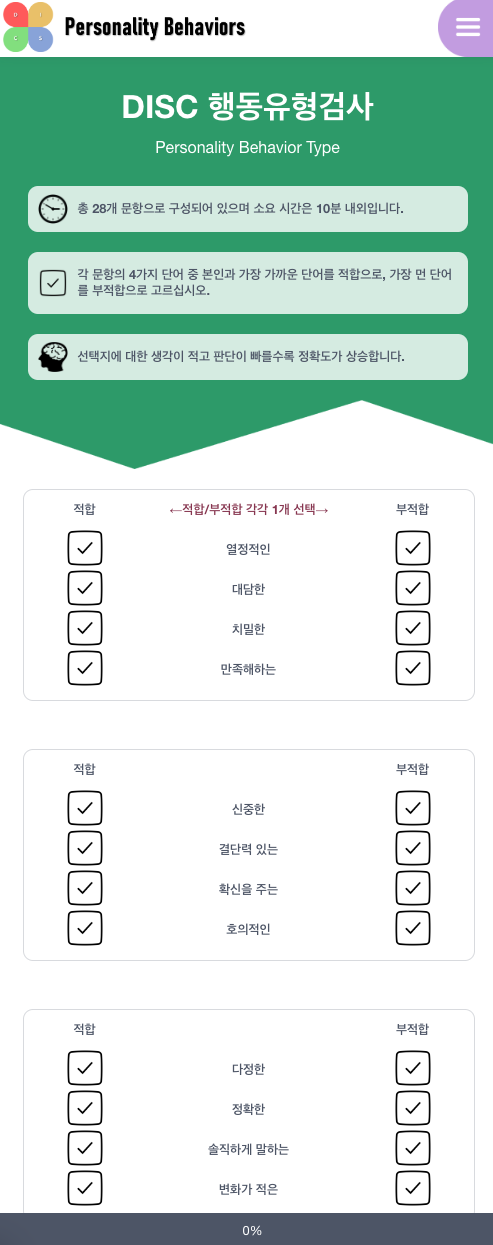 이 테스트는 DISC 행동유형검사의 한 종류인데, 위 사진과 같은 항목에 답변하면 행동유형 결과가 나온다.