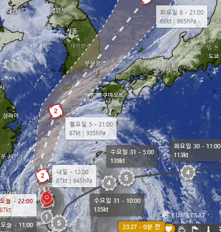 즉, 5일(월요일)과 6일(화요일)에는 한국과 일본 완전히 태풍에 노출된다.