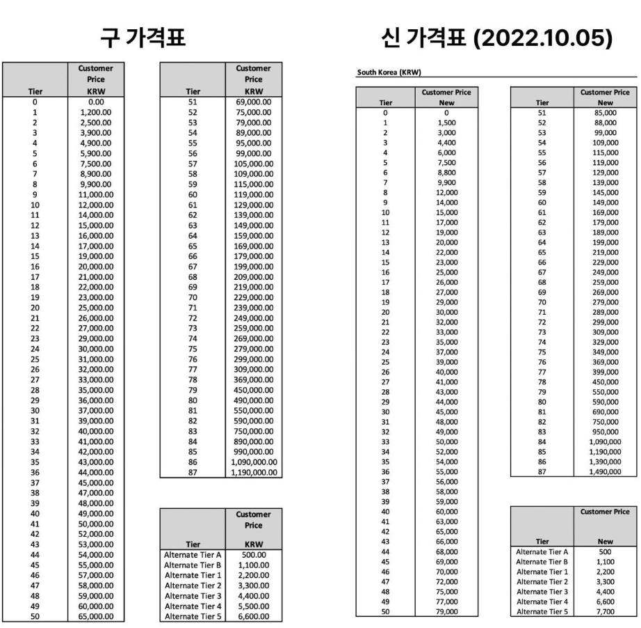이번 인상이 적용되면 1티어가 1500원, 2티어가 3000원, 3티어가 4400원 등으로 일괄 인상된다.