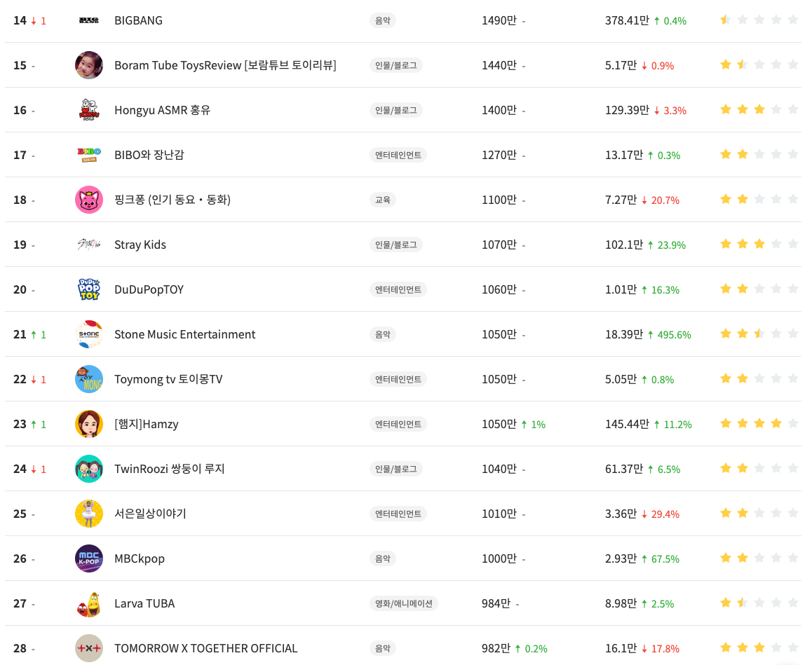 TOP 100 유튜브 채널. 유튜브 순위, 조회수 순위 등 랭킹 순위를 쉽게 확인해 보세요