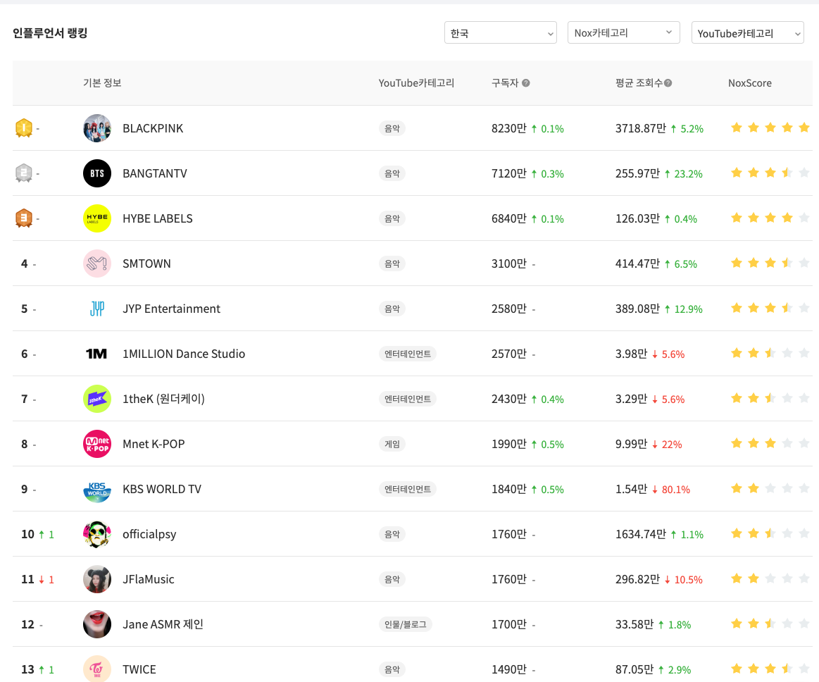 유튜브 순위 TOP 100 - 녹스인플루언서