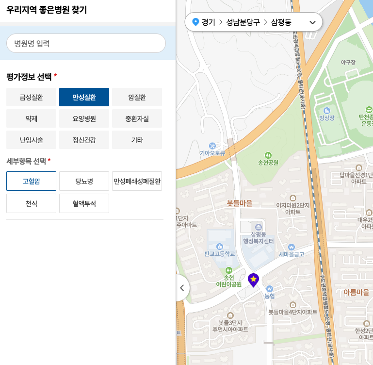 아래 예시) 평가정보(만성질환) + 세부항목(고혈압) + 지역(경기 성남분당구 삼평동)