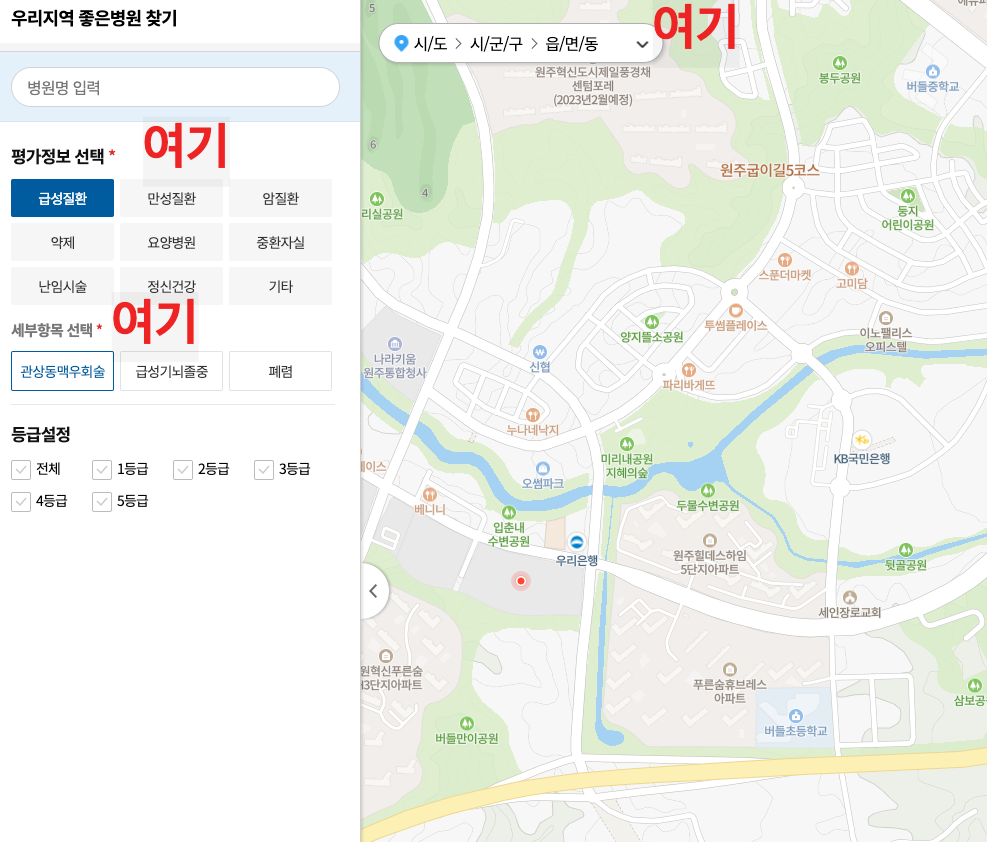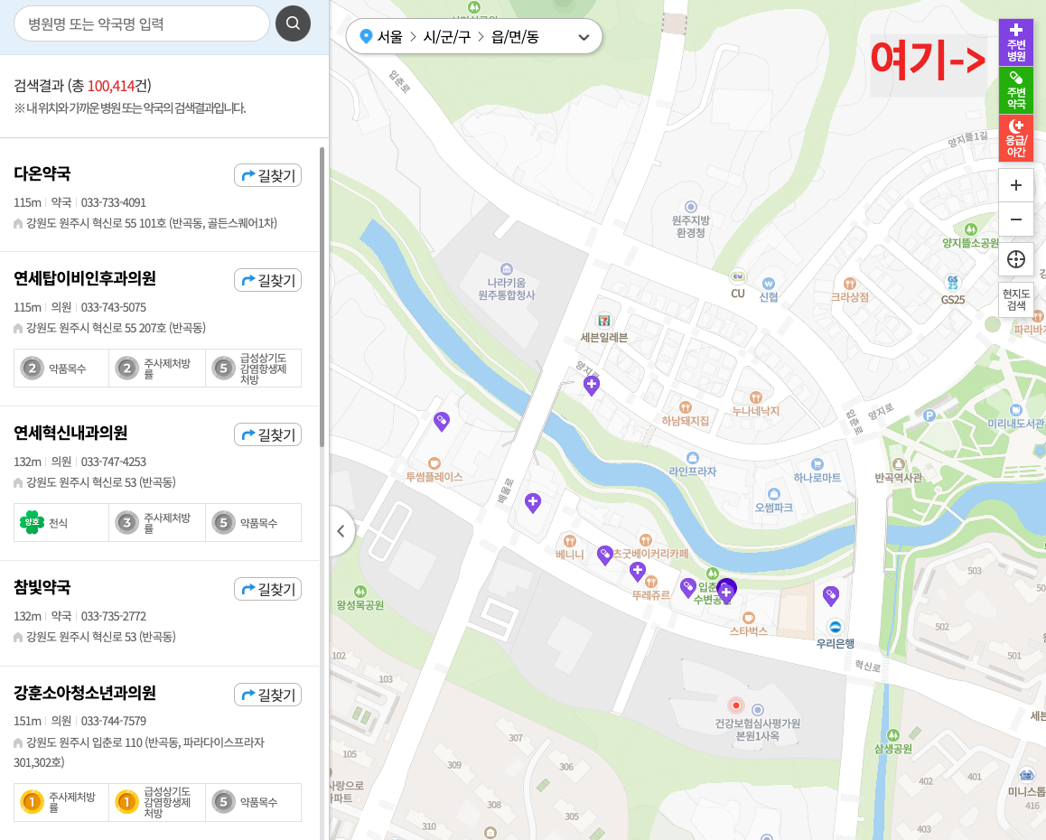 우측상단의 '주변병원', '주변약국', '응급/야간' 버튼을 눌러서 추가 유용한 정보도 얻을 수 있다.