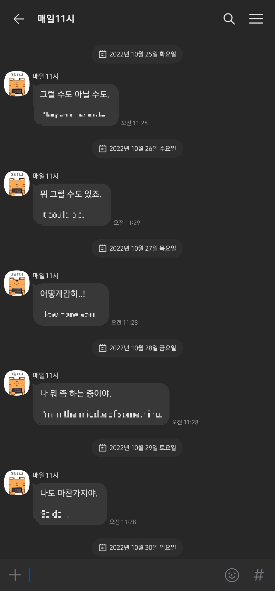 <매일 11시>를 사용하면서 가장 마음에 들었던 부분은 별도 앱이 아닌 카톡으로 진행된다는 것이다.