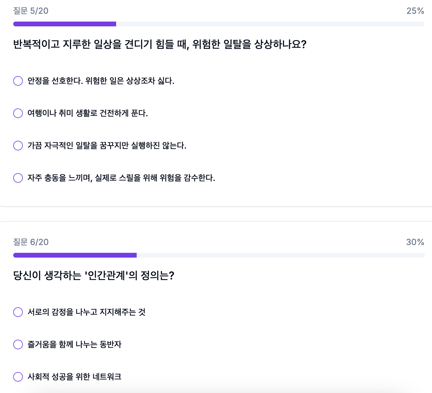 자가진단 사이트에 접속하면 위와 같이 상황에 대한 경향성을 고르는 방식으로 진행된다.
