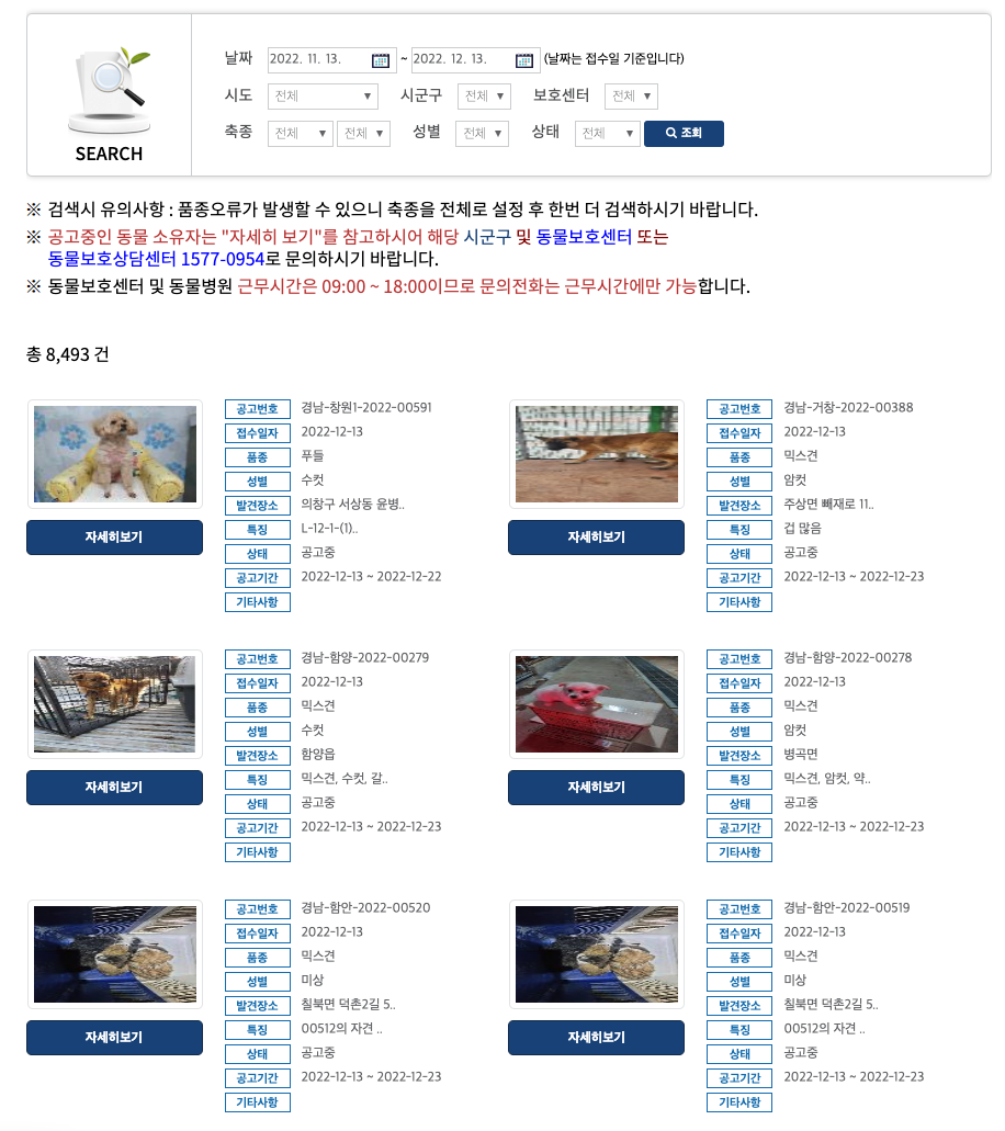공고 중인 동물 소유자는 해당 시군구 및 동물보호센터에 문의하시어 동물을 찾아가시기 바랍니다.