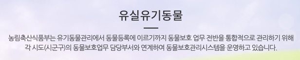 농림축산식품부는 유기동물관리에서 동물등록에 이르기까지 동물보호 업무 전반을 통합적으로 관리하기 위해 각 시도(시군구)의 동물보호업무 담당부서와 연계하여 동물보호관리시스템을 운영하고 있습니다.