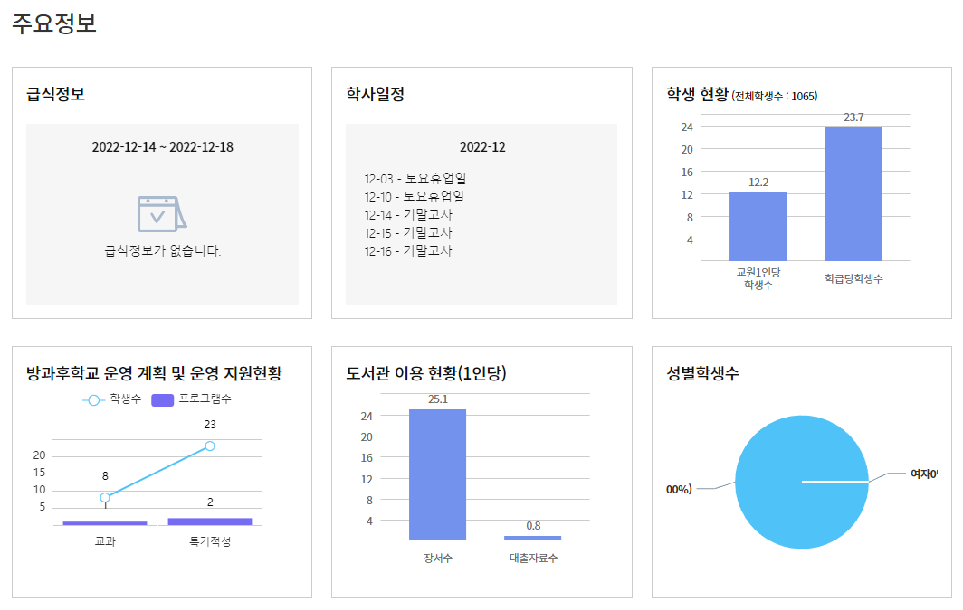 급식정보, 학사일정, 학생현황, 방과후학교 정보, 도서관 이용 현황, 성별 비율 등을 보여준다.