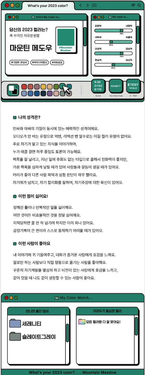 성격, 좋아하는 것, 싫어하는 것, 그리고 잘 맞는 컬러와 맞지 않는 컬러를 알려준다.