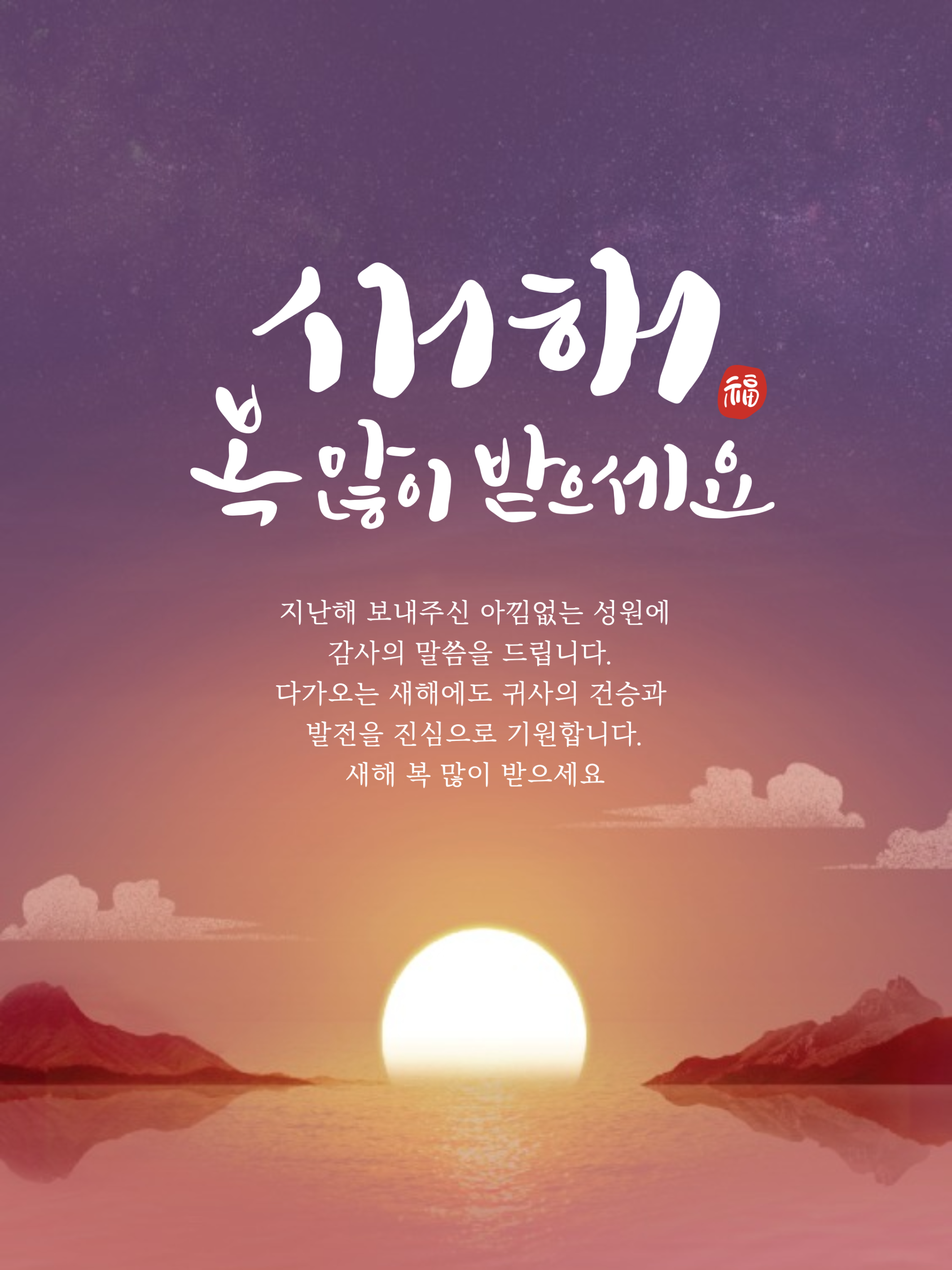 - 항상 따뜻한 마음으로 함께해주셔서 늘 감사했습니다. 더 좋은 일들을 만들기 위해 더욱 노력하겠습니다. 새해에도 건강과 행복이 언제나 함께 하시길 바라며 만복이 깃드시길 기원합니다.