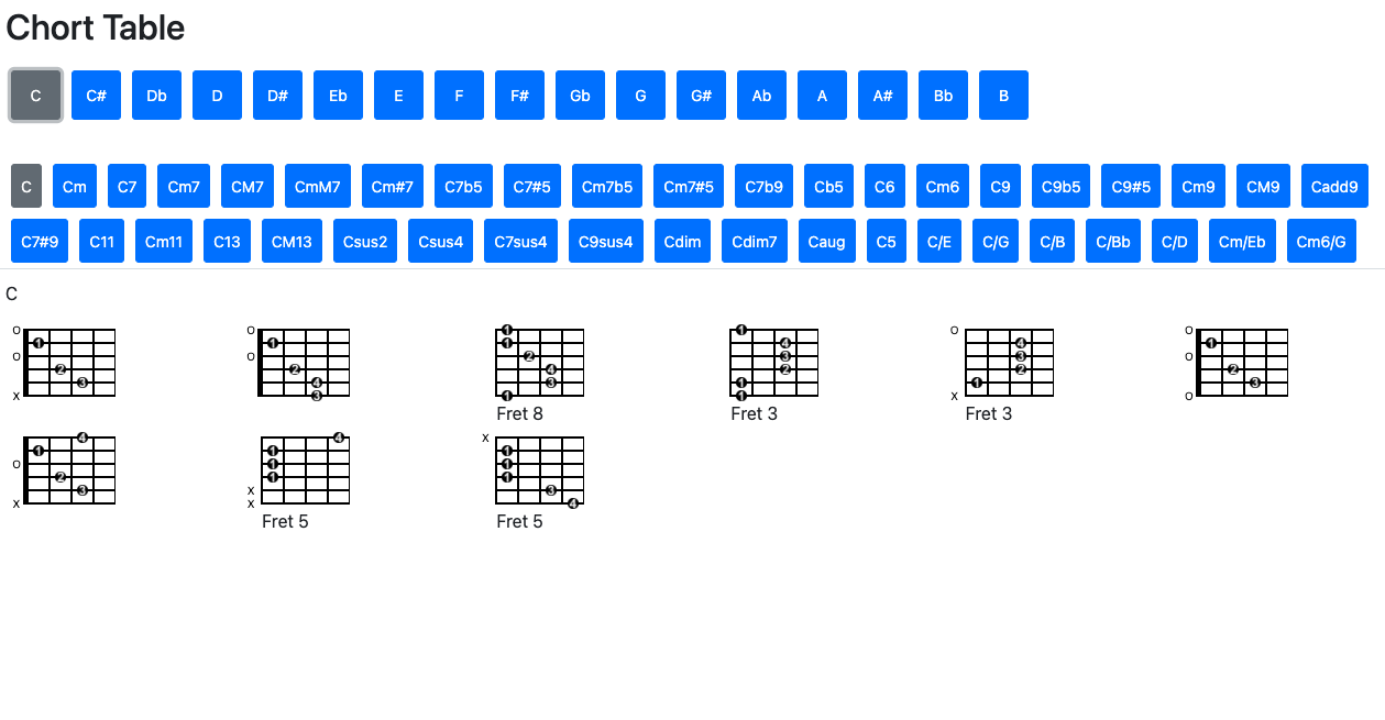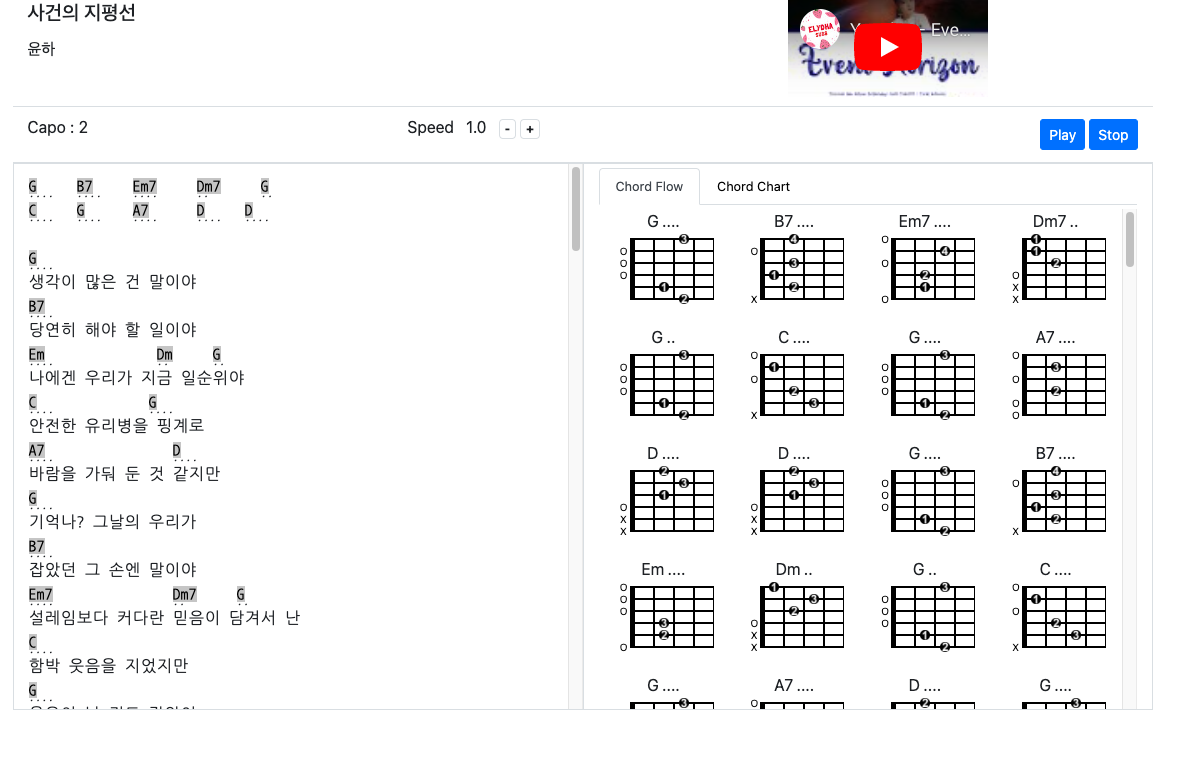 Play버튼을 누르면 마치 노래방 가사가 흘러가듯이 현재 기타로 쳐야하는 코드가 강조된다.