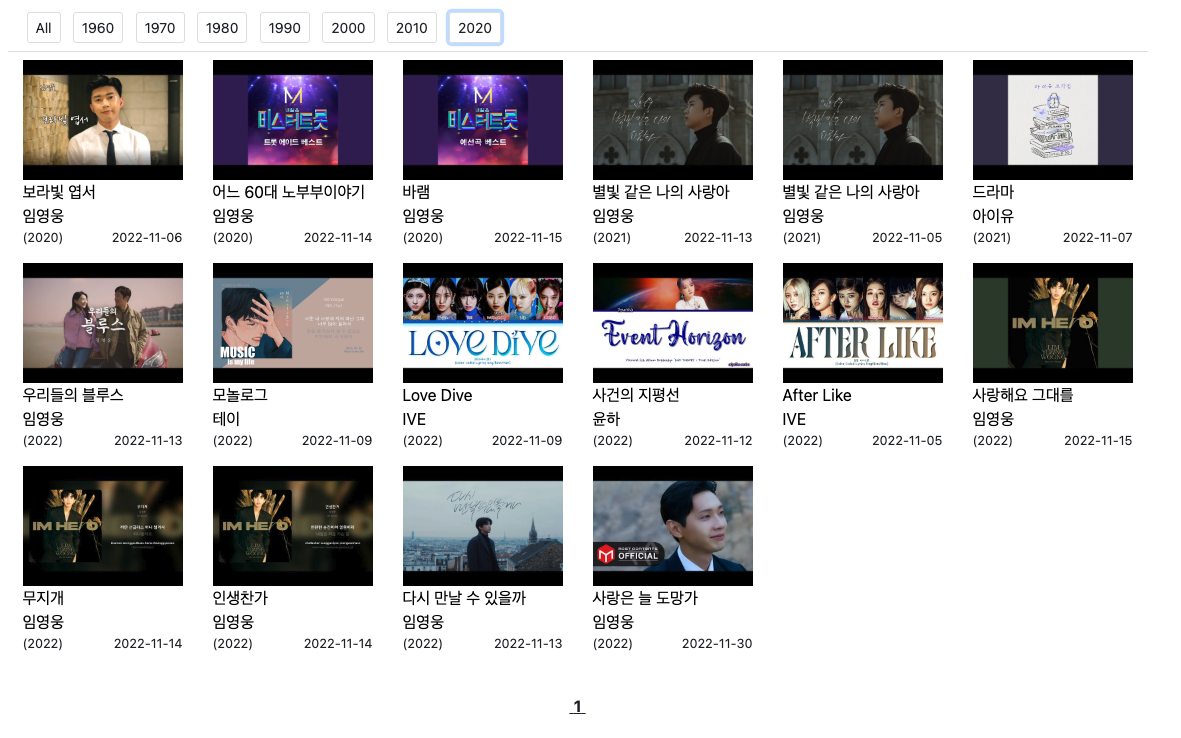 1960년대 추억의 노래부터 2020년대 노래를 분류하여 제공한다.