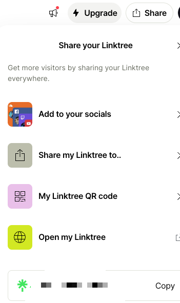 첨언) 링크트리 주소를 모르신다면 아래에서 Share버튼을 클릭하고 copy버튼을 클릭하여 복사하면 된다.
