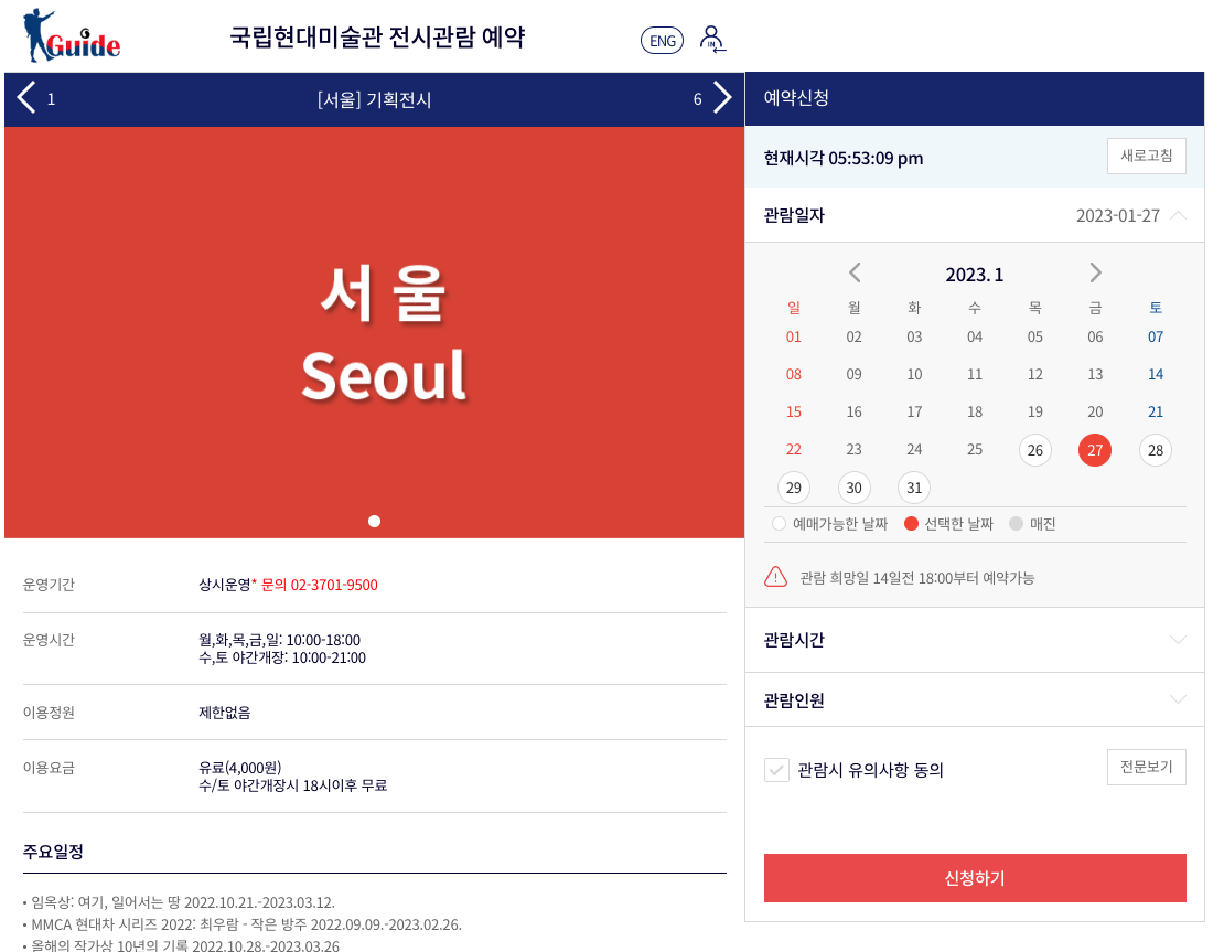 관람할 전시회를 클릭하여 해당 전시 예약 페이지에 접속하면,