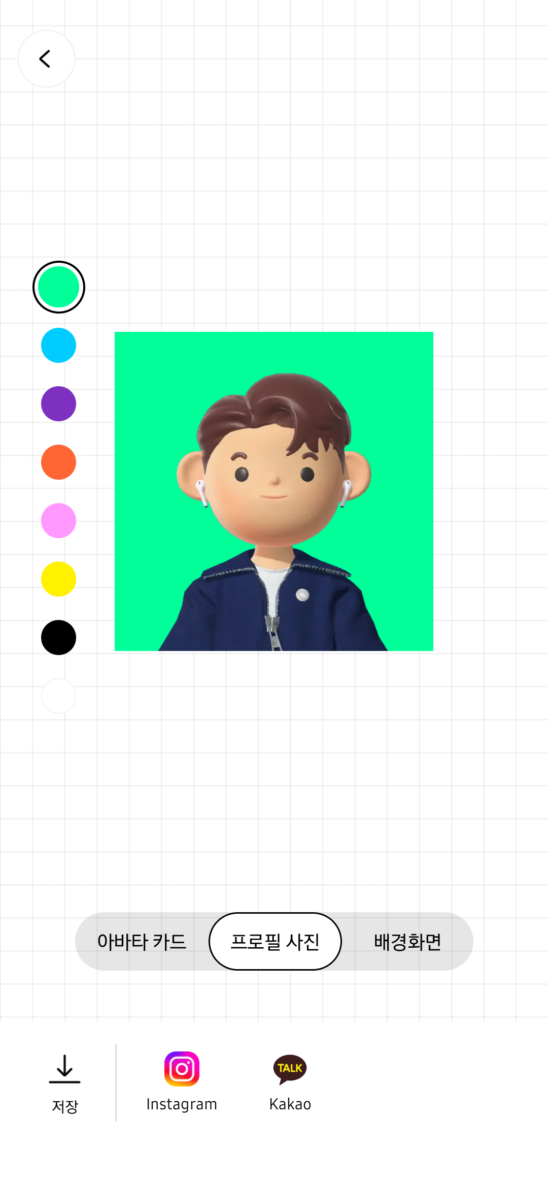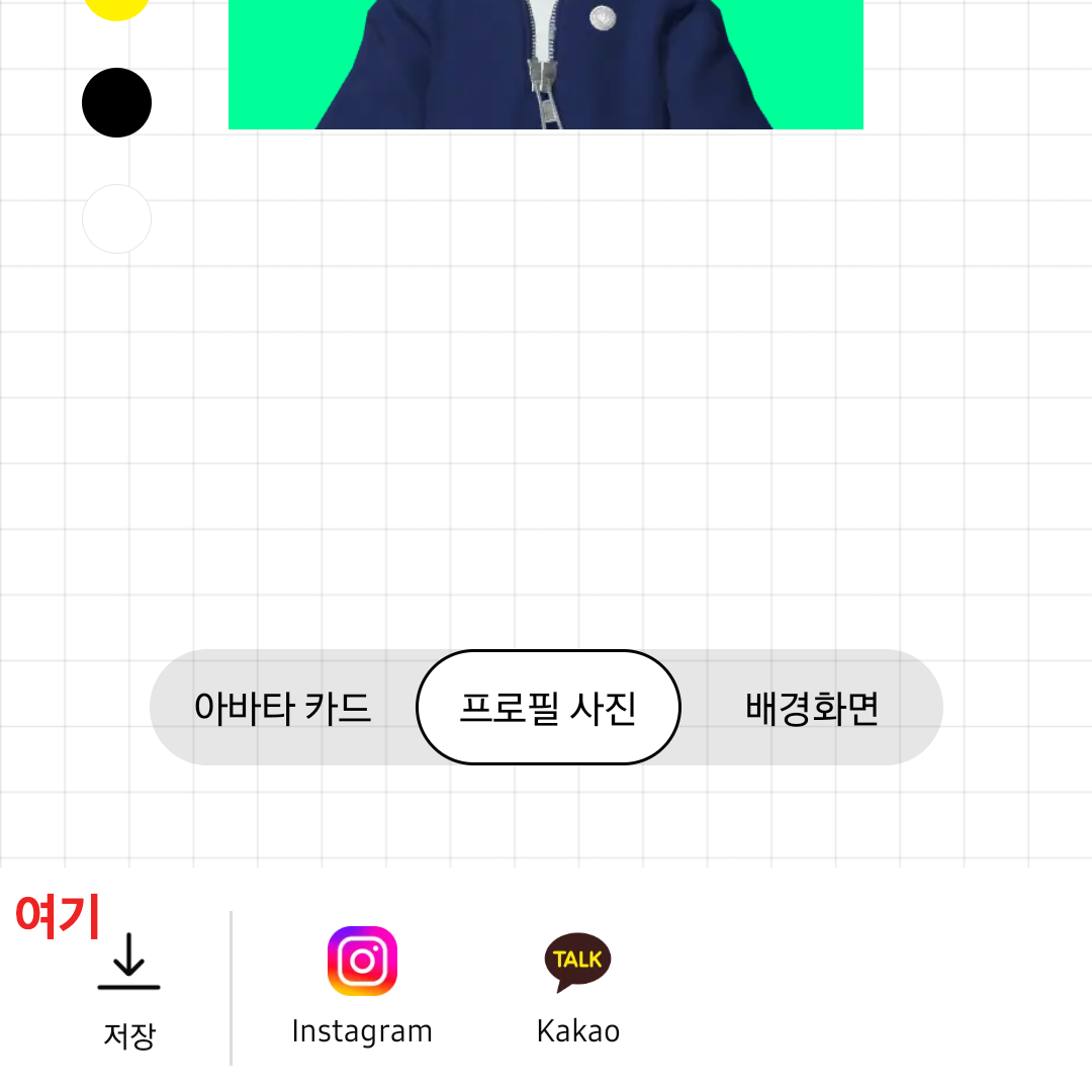 프로필 사진 공유를 위해서는 저장 버튼 옆의 '인스타그램 또는 카카오 로고' 버튼을 누르면 된다.