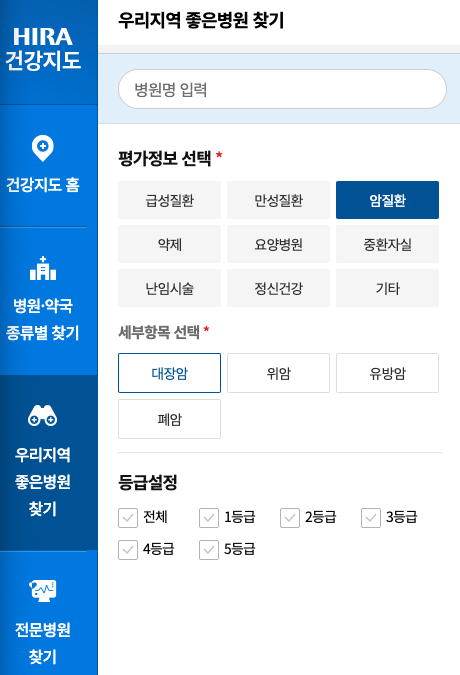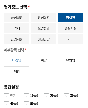 2. "평가정보 선택" 란에서 "암질환"버튼을 누르고 세부항목을 선택한다.