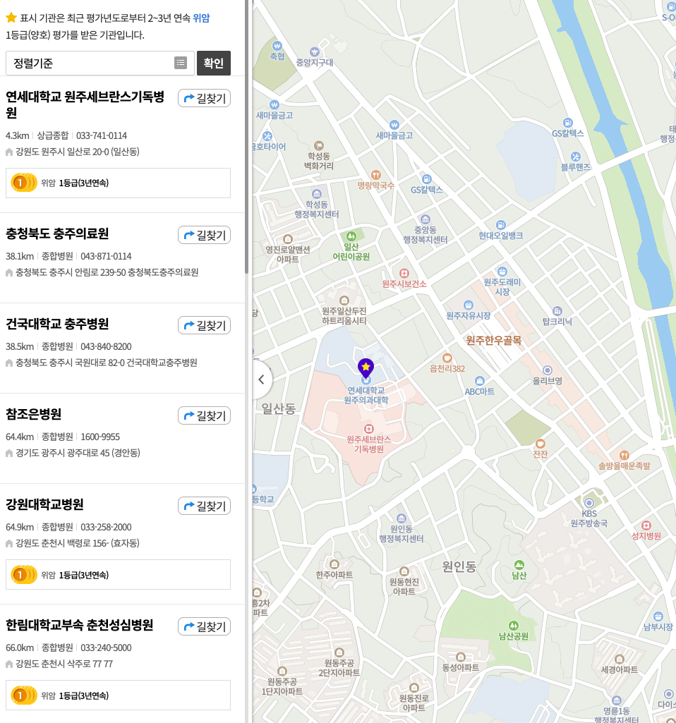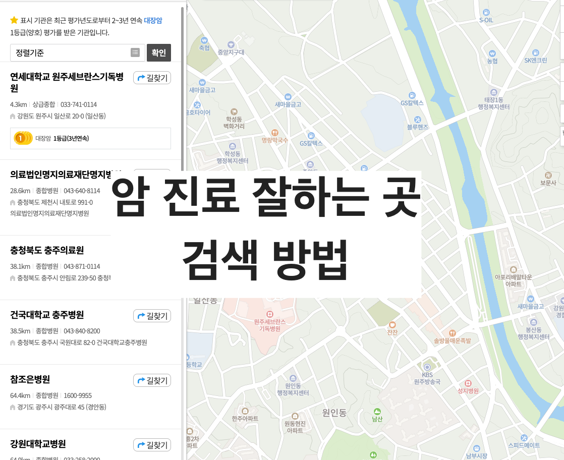 4. 검색 결과, 해당하는 암 질환에 대해 진료를 가장 잘하는 주변 병원이 표시된다.