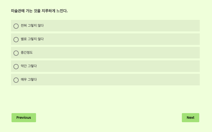 4. 테스트 방식 : 상황을 질문으로 받고, 정도를 5가지 범위 내에서 고르는 객관식이다.