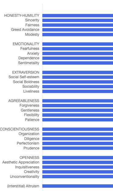 대문자로 표시된 특성은 6개의 광범위한 HEXACO 성격 요인입니다. 이 여섯 가지 각각 아래의 네 가지 특성(소문자로 표시됨)은 각 요인에 속하는 더 좁은 "패싯" 수준 특성입니다. 나머지 특성인 이타주의는 세 가지 광범위한 요소(정직-겸손, 감정 및 친화성)와 관련된 측면입니다.
