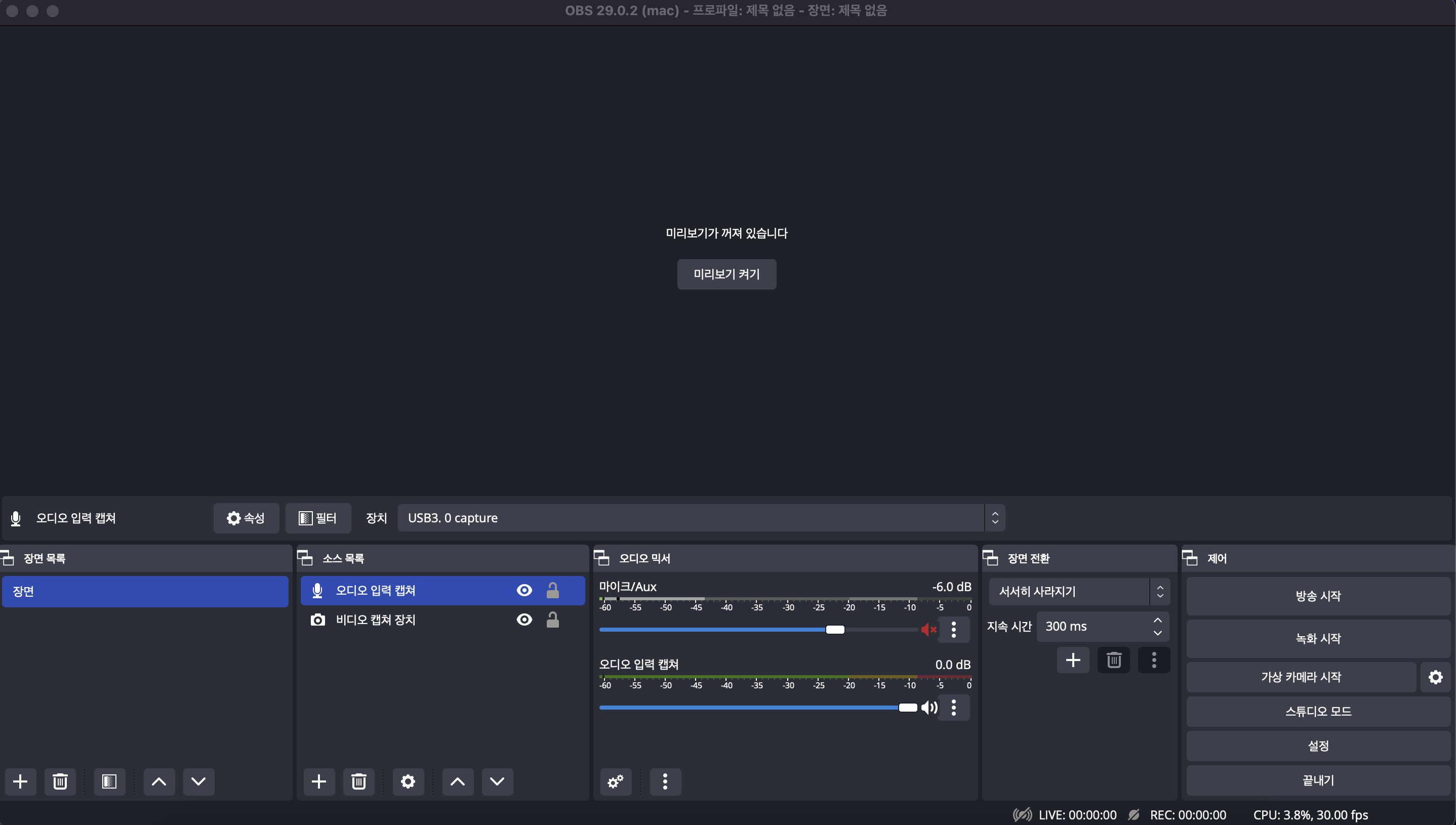 8. 이제 입력으로 들어오는 동영상의 오디오가 들리는지 확인해보자. 소리가 작다면 오디오 믹서에서 오디오 입력 캡쳐의 소리 크기를 조절하면 된다.