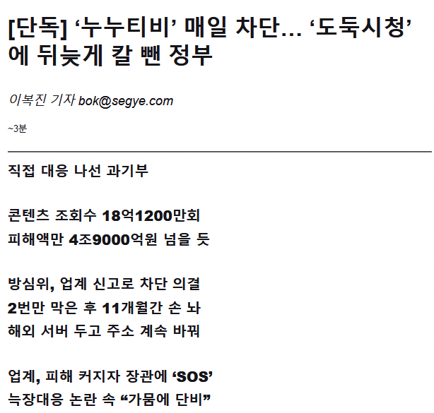 정부는 이 누누티비를 매일 차단하고, 운영자를 수사하겠다고 밝혔다.