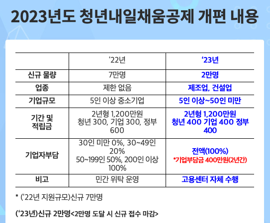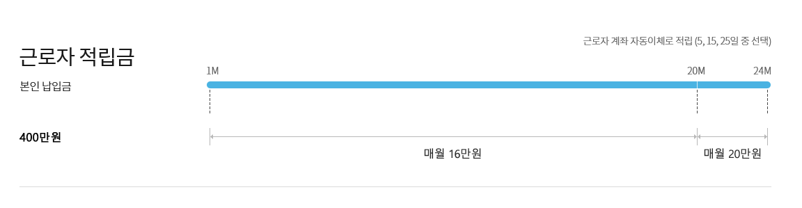 - 2년간 400만원을 적립하면 정부가 400만원, 기업이 400만원을 공동 적립하여 만기 시 1,200만원의 목돈 마련