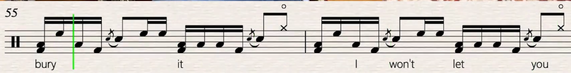 중간에 [스몰탐 -> 라지탐 -> 플로어 탐 -> 베이스 드럼 -> 스네어 드럼 -> 하이햇 심벌]로 이어지는