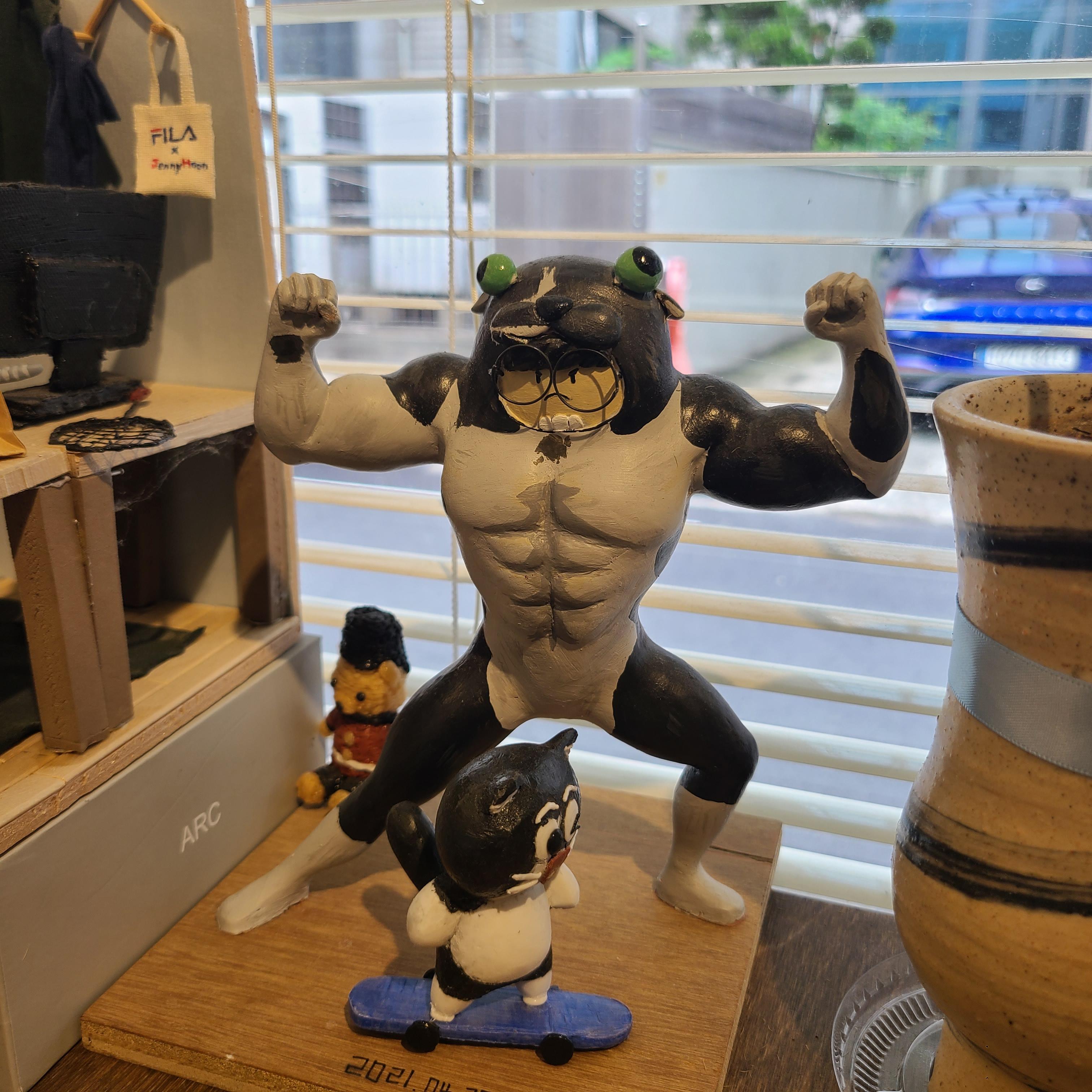 사나고님의 작업하는 모습을 만든 모습(우) : 뒤에 있는 '우왁굳'님 얼굴과 책상 위 아래에 있는 사나고님 애완묘들을 구경하는 디테일 덕에 보는 맛이 있었다.