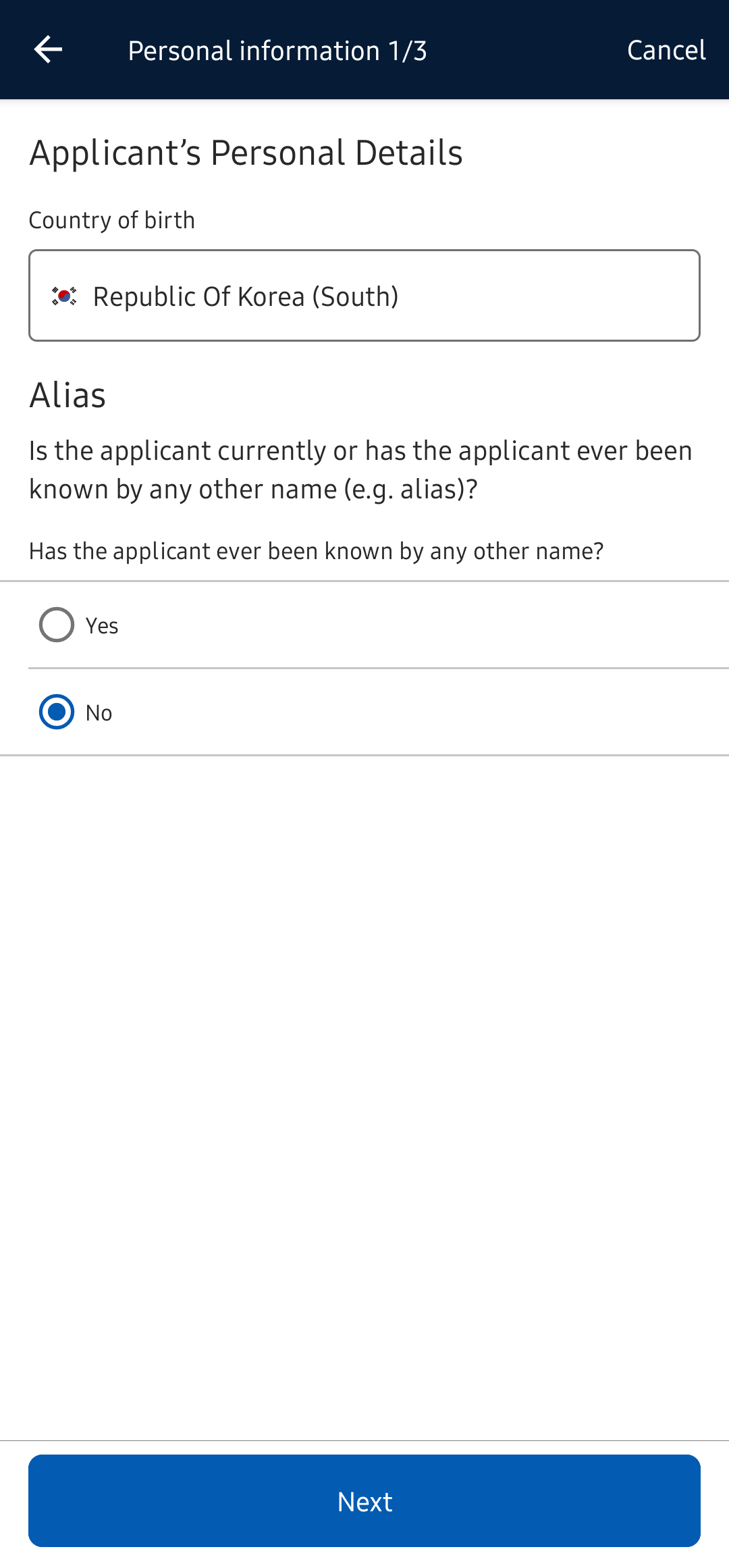 신청가 이전에 출생국가가 아닌 다른 국가로 신청했는지 유무를 체크하는 창.