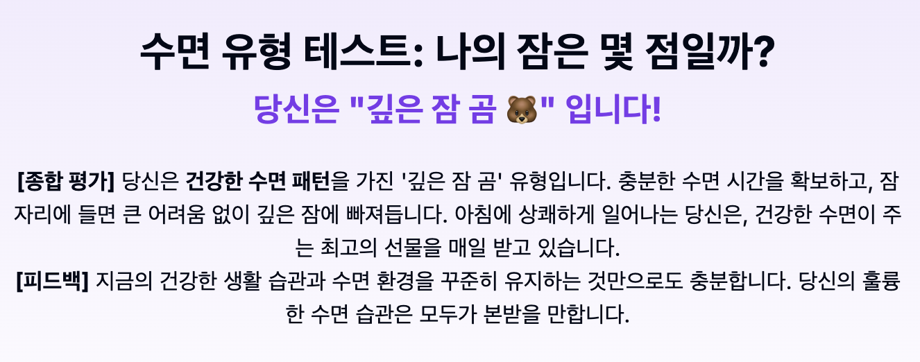 아래와 같이 나의 수면 유형이 결과로 나타난다.