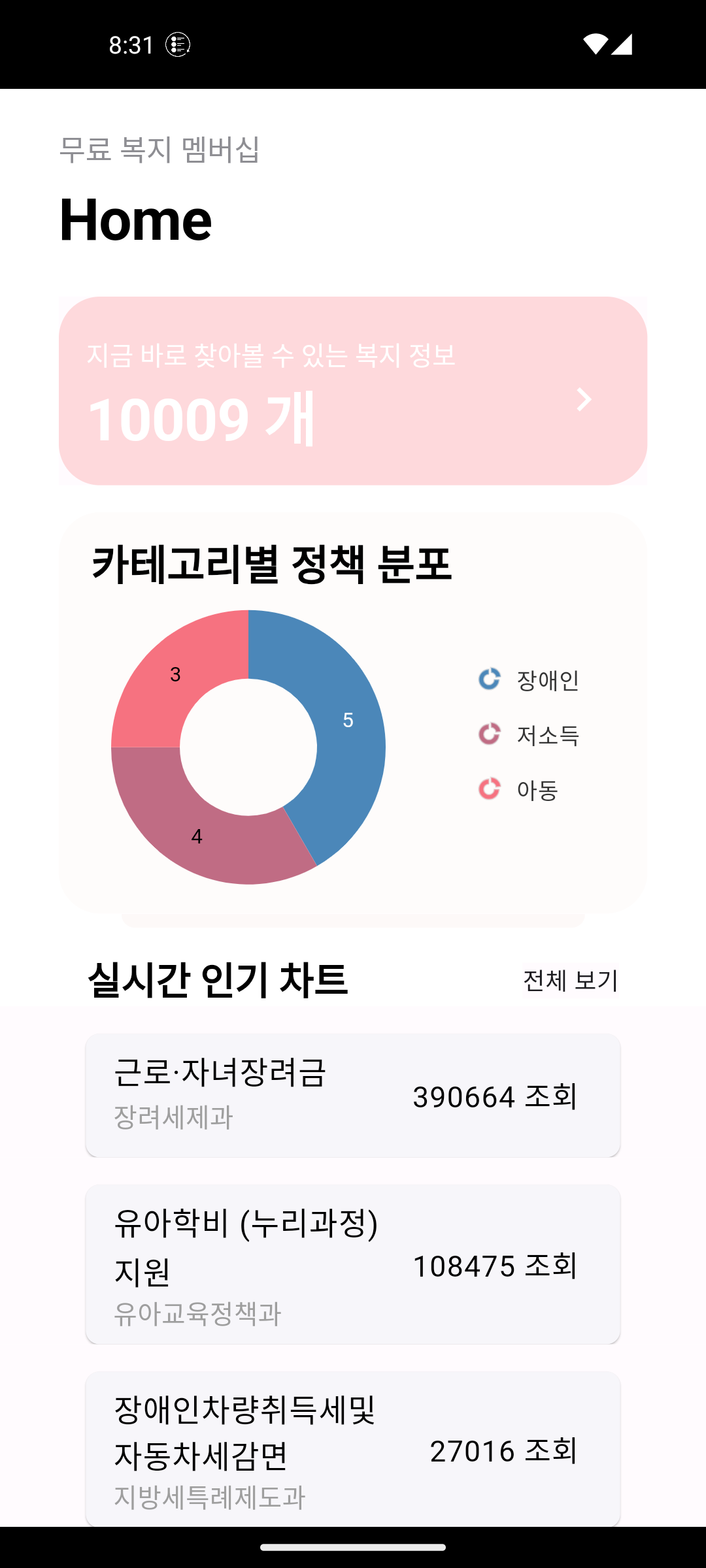 복지 정책의 분포, 그리고 인기 차트를 확인할 수 있습니다.