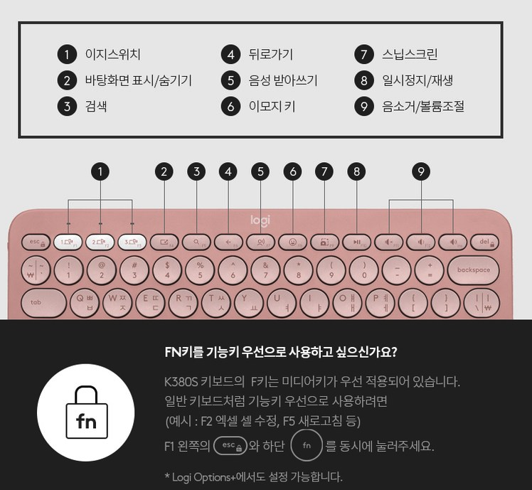 K380S에서는 새로 추가된 단축키가 사용성을 더욱 향상시켰습니다. 더 빠르게 작업하고 필요한 기능에 즉시 접근하여 생산성을 높이세요.