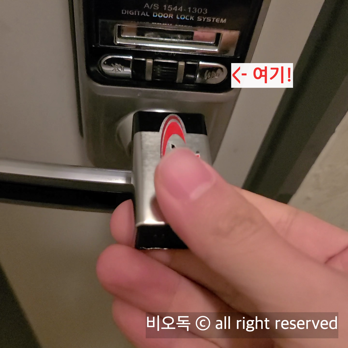 ↓ 아래 사진과 같이 배터리를 비상전원부에 갖다댄채로 도어락을 켭니다.
