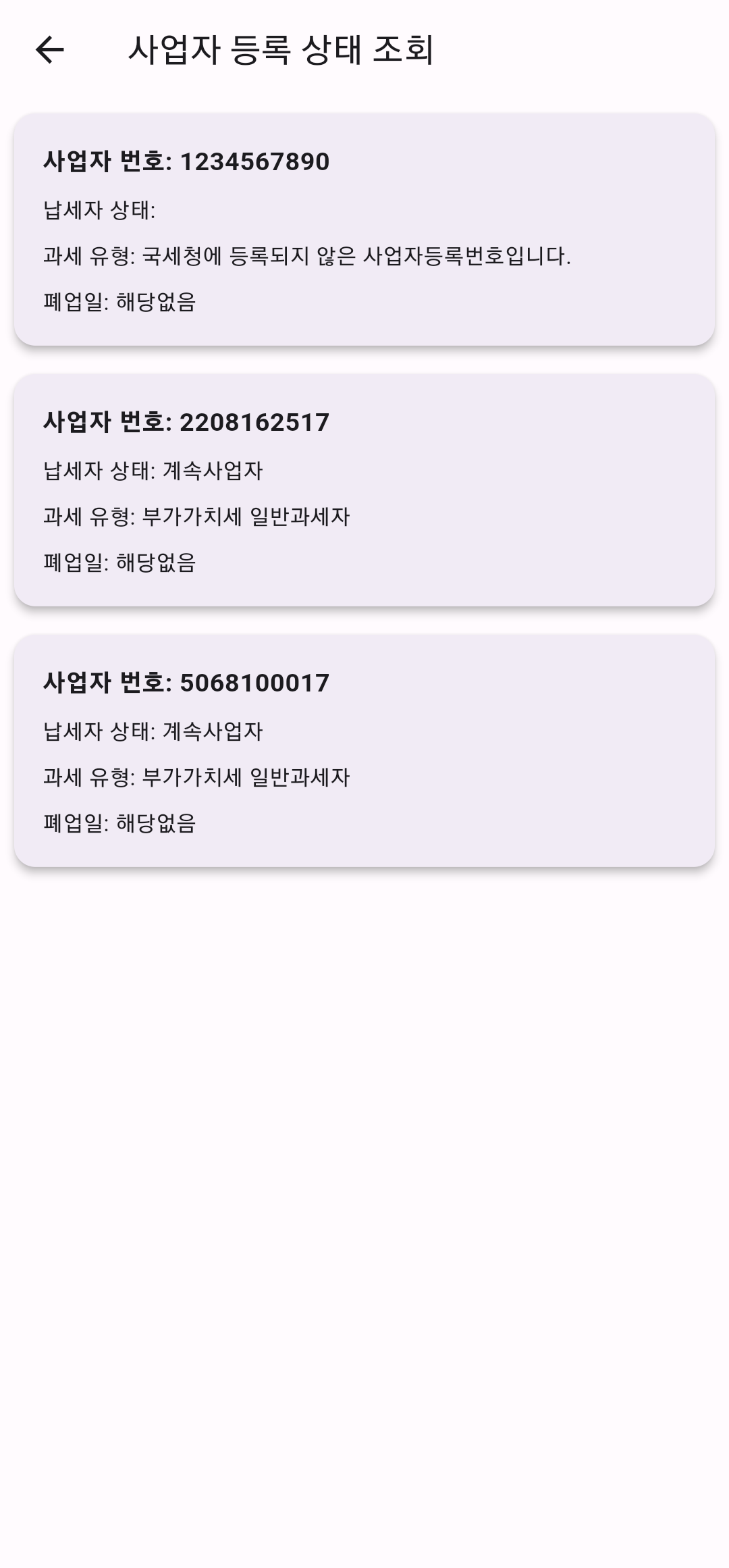 사업자 등록번호, 납세자 상태, 과세 유형, 폐업일 등 다양한 정보를 한눈에 파악하세요.