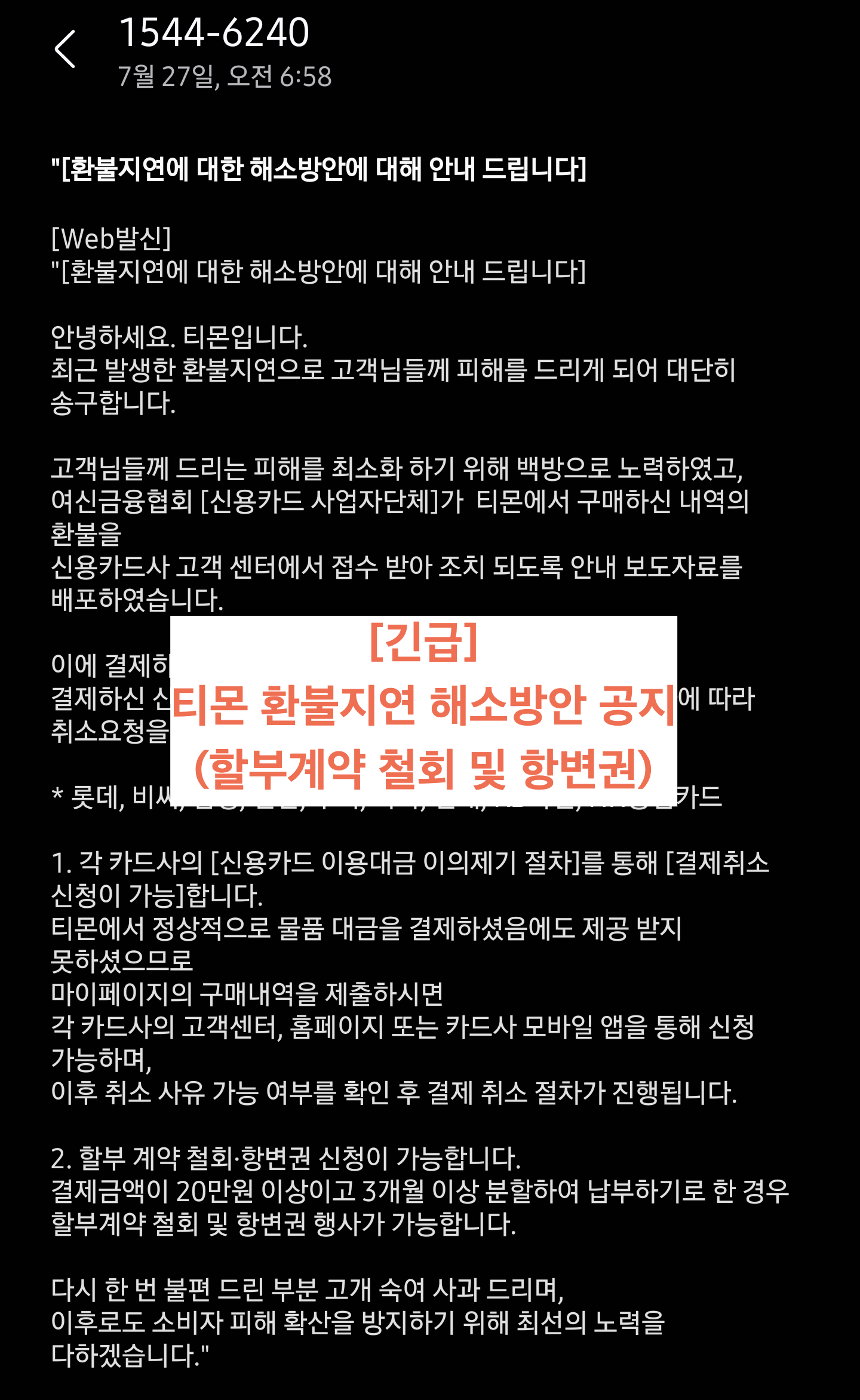 티몬으로부터 전달받은 환불지연 방안