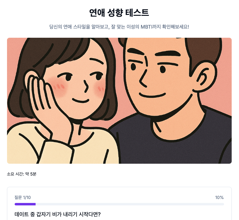 이 테스트는 간단한 질문을 통해 당신의 연애 스타일을 분석하고, 가장 잘 맞는 MBTI 유형을 추천해줍니다.