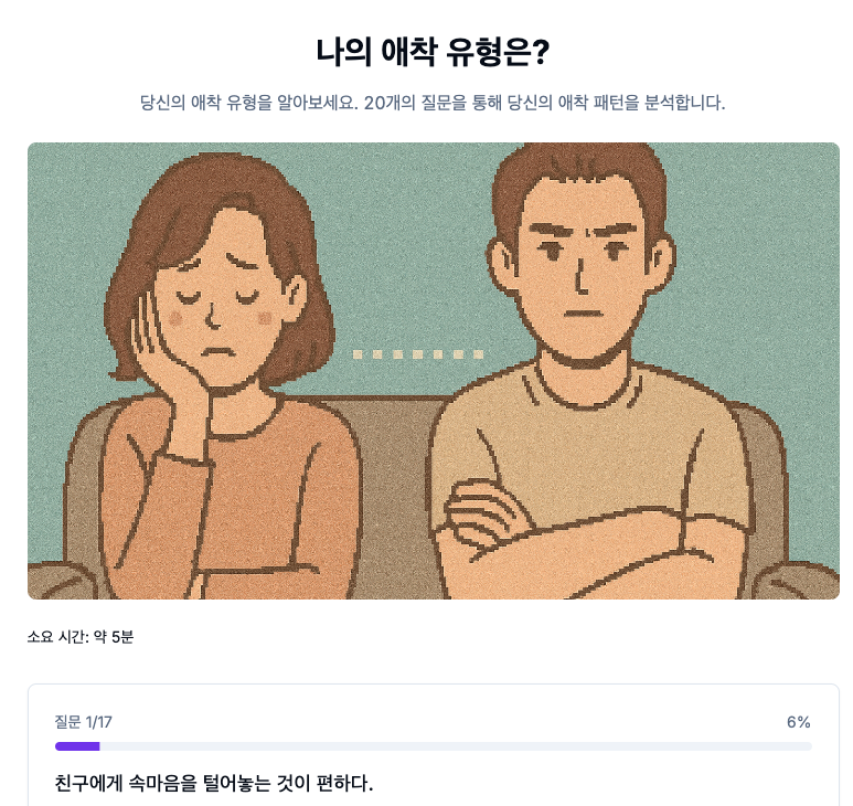 자신의 애착 유형을 이해하는 것은 자기 성장의 첫걸음입니다. 이 테스트를 통해 자신을 더 깊이 이해하고, 더 건강한 관계를 형성해보세요.